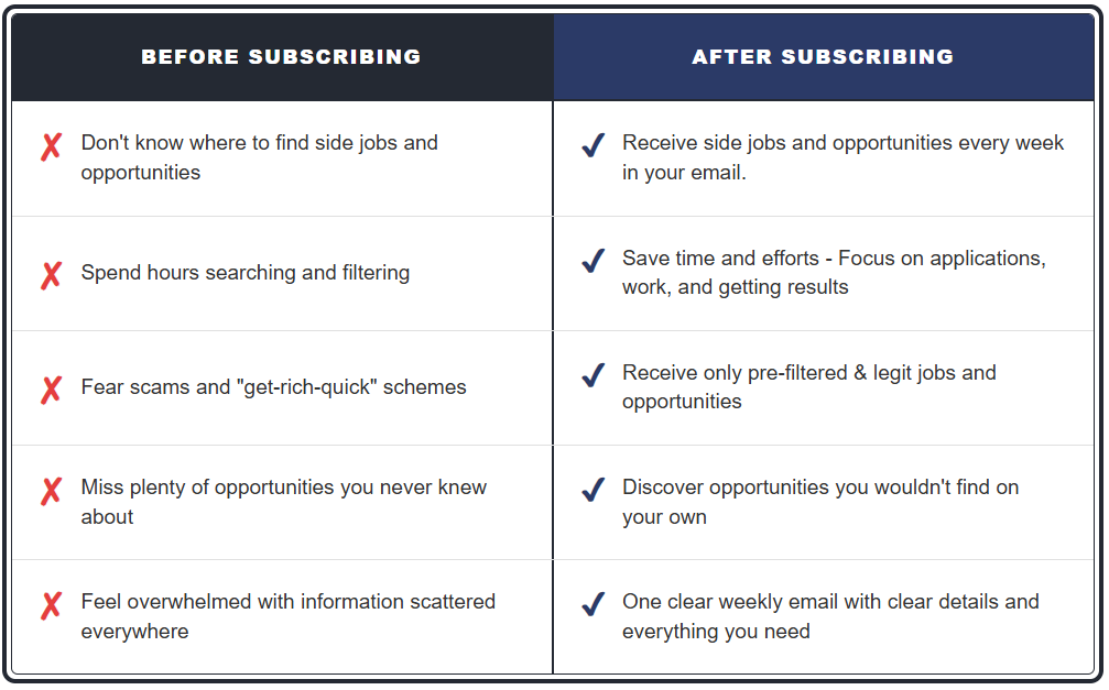 Don't wait for the whole week? Upgrade to get daily job alerts, early access, guidance and exclusive resources designed to help you succeed in your side jobs journey.